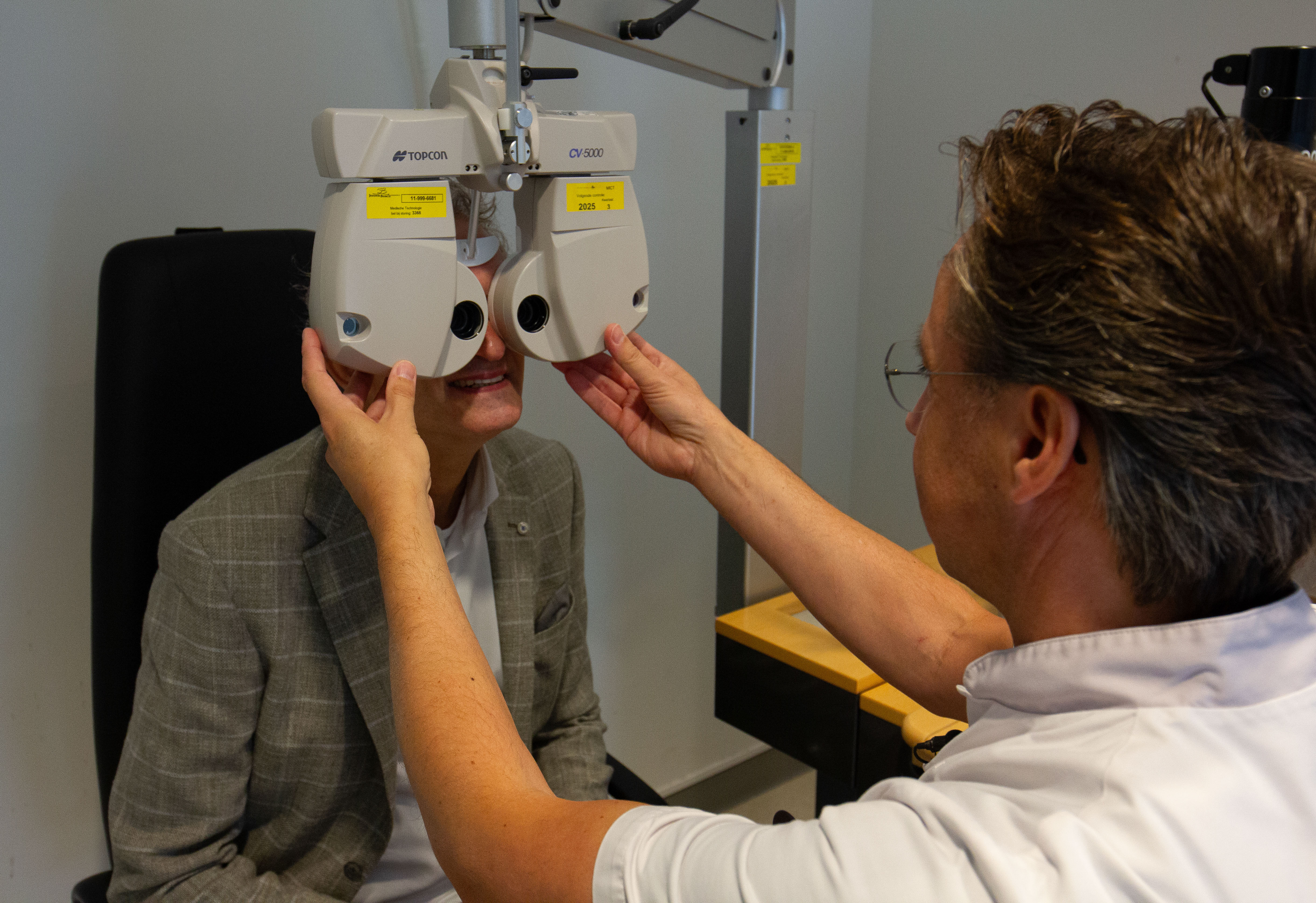 Ouafa: U krijgt van mij deze bril op. Dan ga ik meten hoeveel u kunt zien.